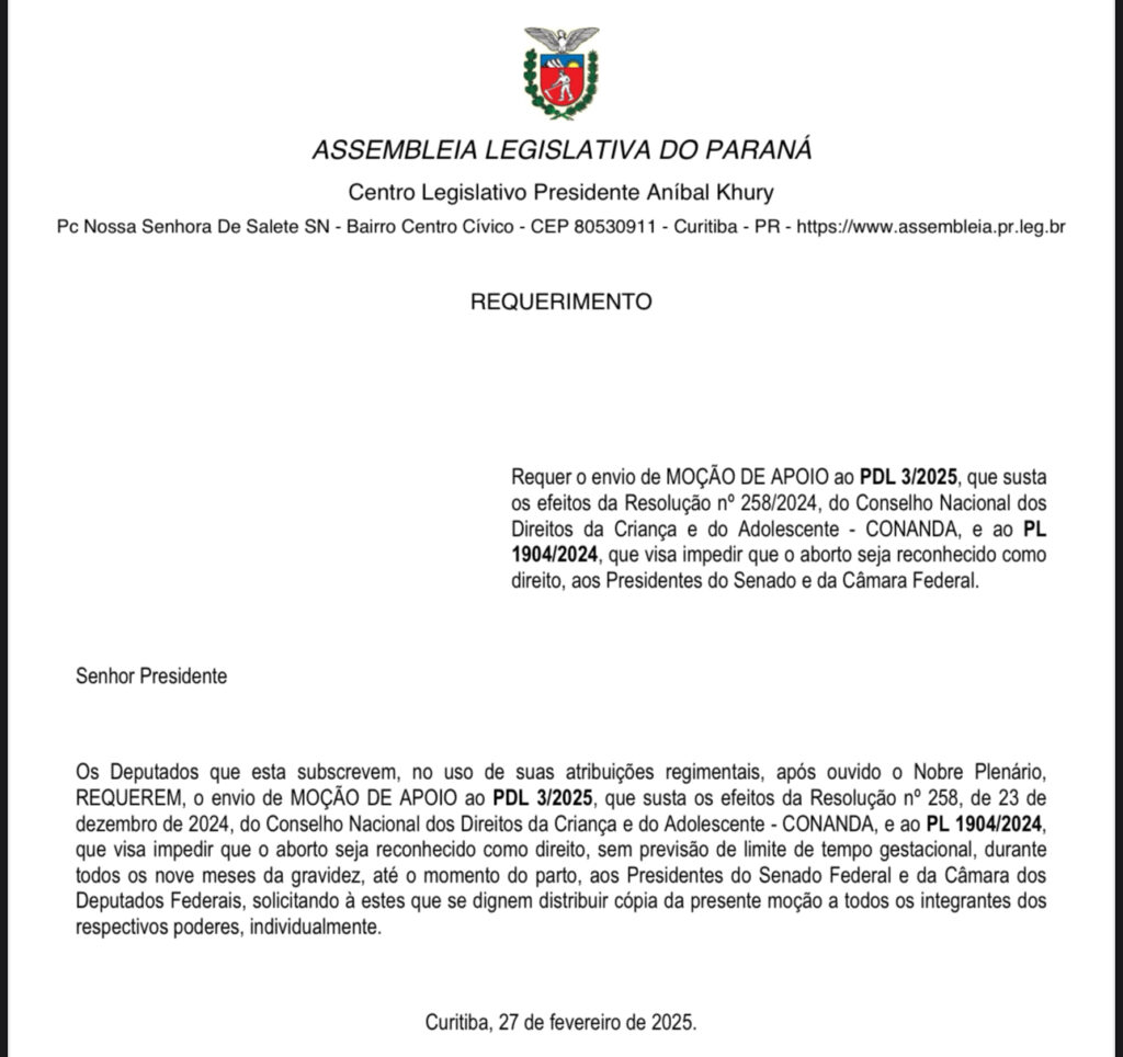 No documento, endereçado aos presidentes do Senado Federal, David Alcolumbre, e da Câmara dos Deputados, Hugo Motta, os deputados paranaenses defendem o direito à vida do nascituro e se posicionam publicamente contra a Resolução do CONANDA.